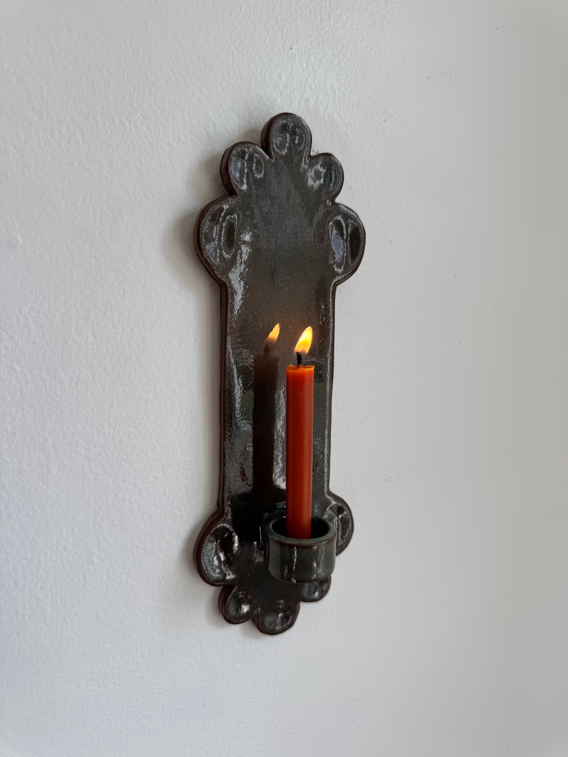 The perfect candle tapered candle sconce with little divots. Fits a small tapered candle with metal hook on back. About 9.5 inches long.