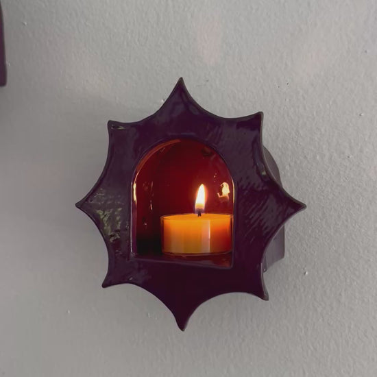 Dark Plum star tea light votive on dark red stoneware. So moody!