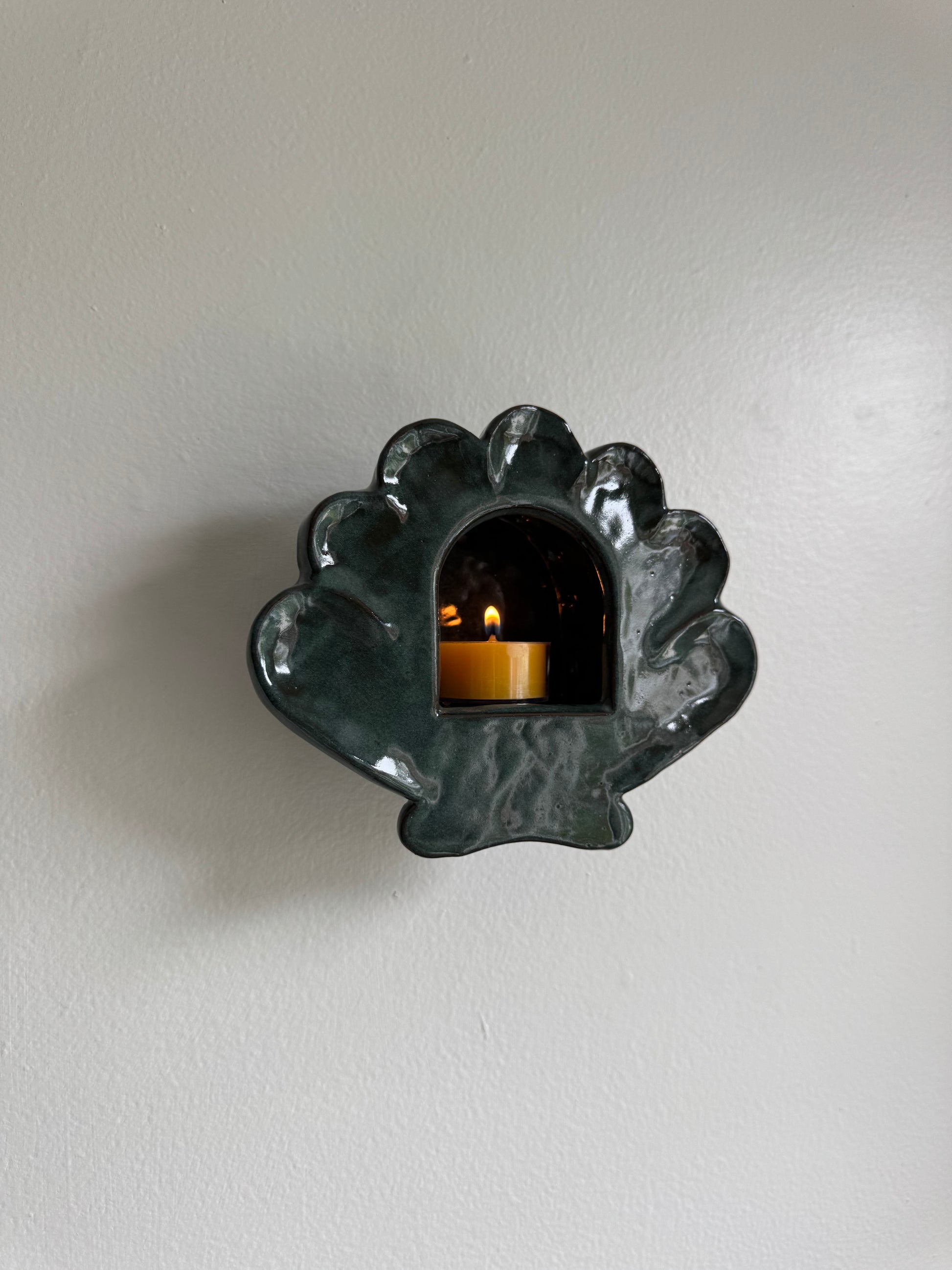 Dark green on rich red stoneware. This is the perfect shell for autumn. Perfectly fits a tealight and has a keyhole for installation.