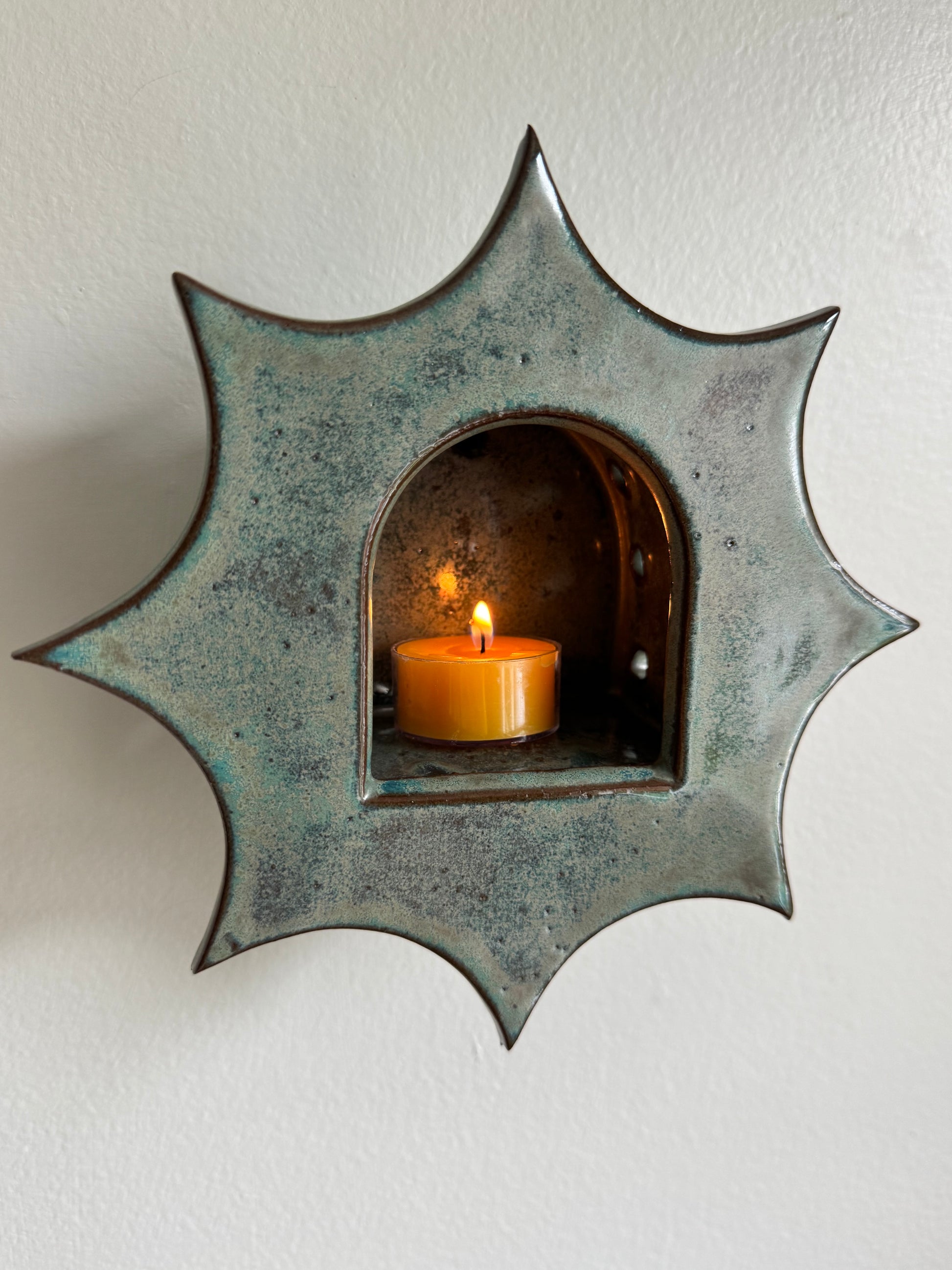 Funky textured green glaze star on dark red stoneware.Perfectly fits a tealight and has keyhole for installation. Each item is handmade one by one and may slightly vary.